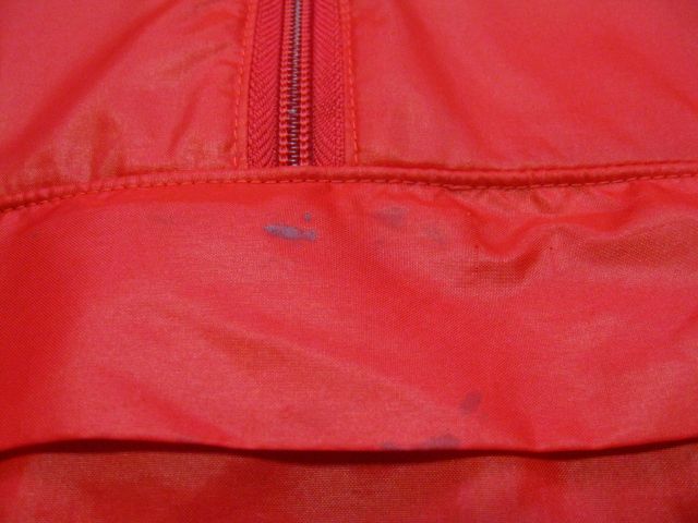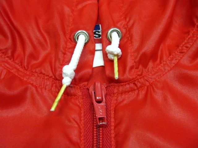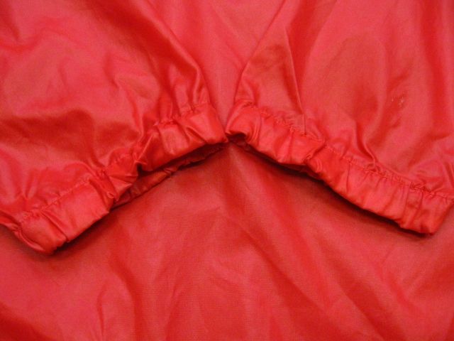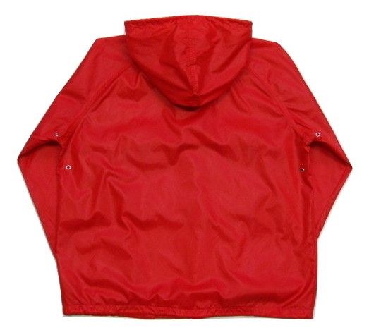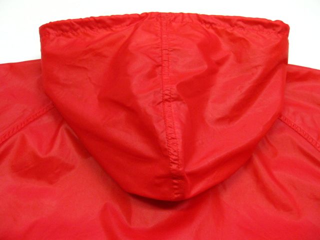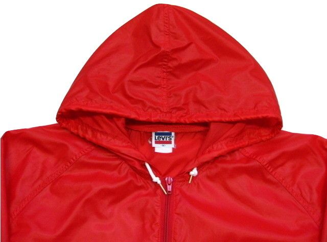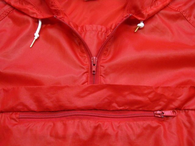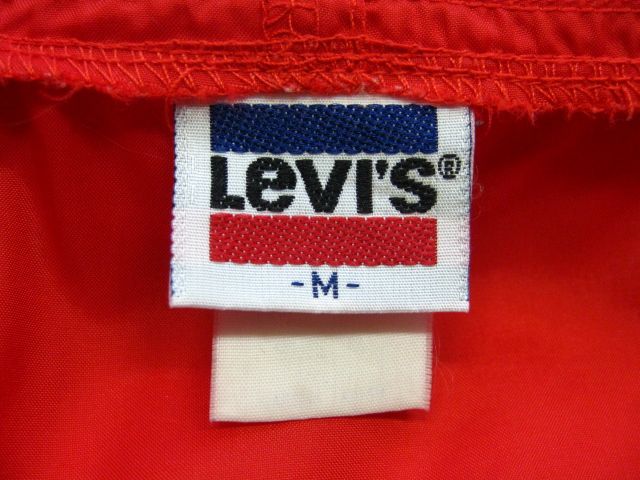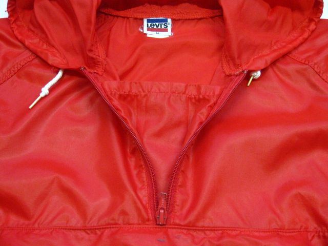 80年代のLevi's ナイロン アノラックパーカです。サイズの表示はMです。実寸は身幅61cm 着丈66cm 袖丈(フード横~)76cmです。フロントはハーフジップでマチが施されております。腹部にジッパー付きのポケットがございます。ジッパーはすべてYKK(良好)です。腹部と左脇、左袖に汚れがございます。ナイロン生地にダメージはございません。脇下にベンチレーションとフード周りと裾にドローコードが施されております。