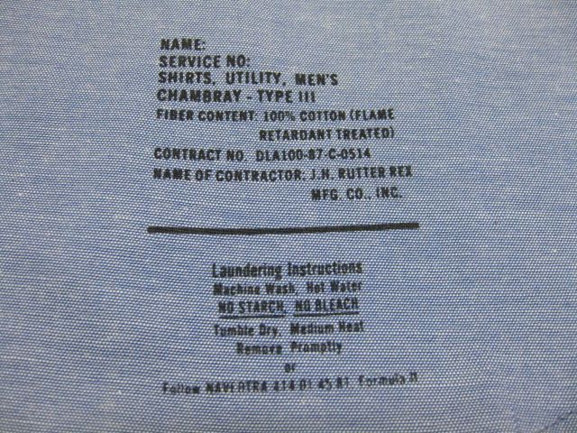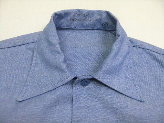 87年のU.S.Army シャンブレーシャツ デットストックです。サイズの表示はXSです。実寸は肩幅38.5cm 身幅47cm 袖丈63cm 着丈83cmです。素材は100%Cottonです。J.N.Rutter rex. MFG.Co.,inc.の製造です。官給品で未使用のデットストックです。生地に汚れやヤケ、ダメージなどはございません。