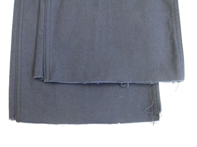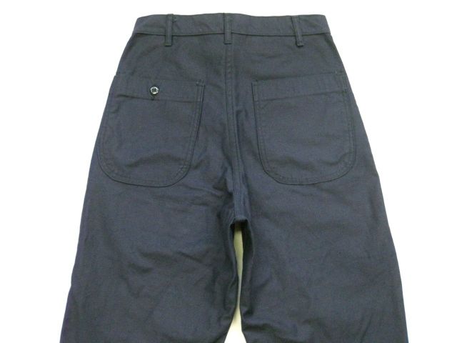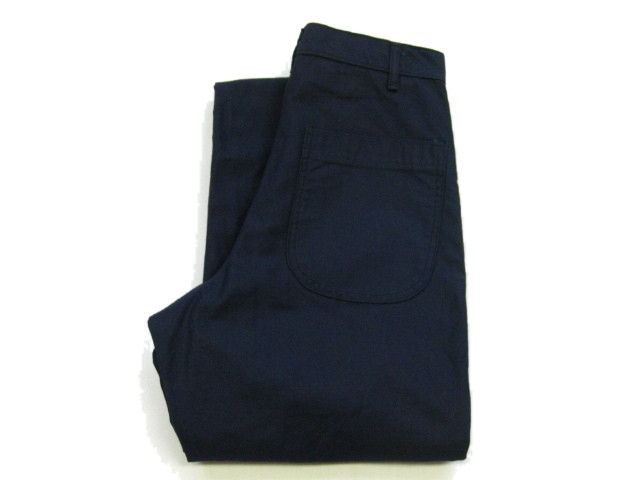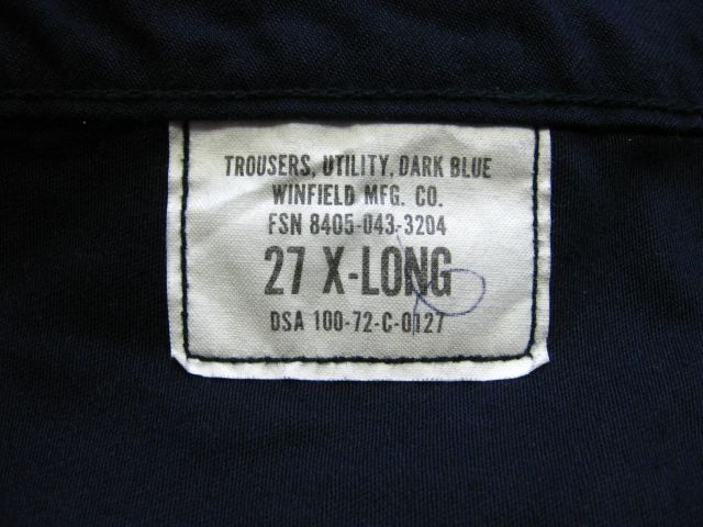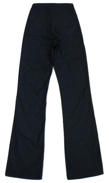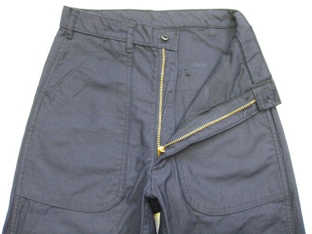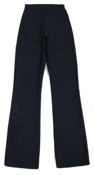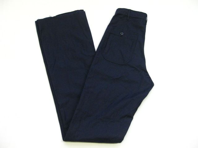 70年代のU.S.Navy Utility pants デットストックです。サイズの表示はW27-Longです。実寸はW67cm L95cm ワタリ29cm サイド総丈124cmです。素材はコットンとポリの混紡地です。裾はまつられておらず切りっぱなしの状態です。ジッパーはRAPIDです。未使用です。汚れやダメージなどはございません。形の綺麗なパンツです。お女性の方にもお勧めします。