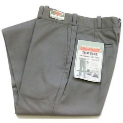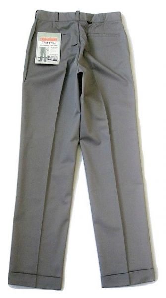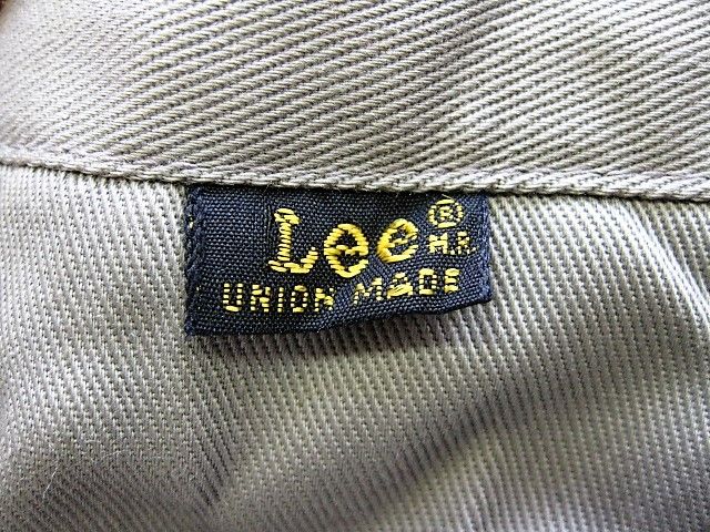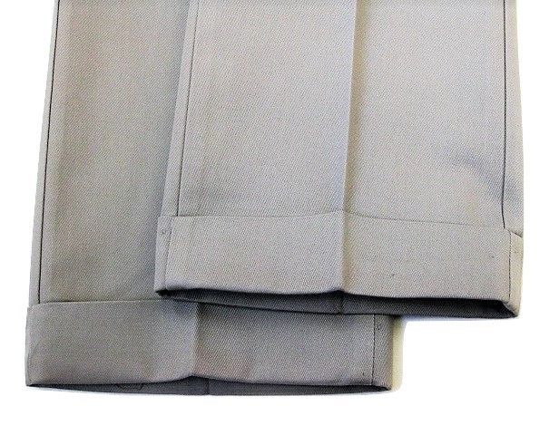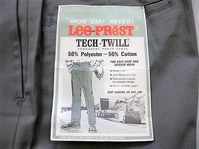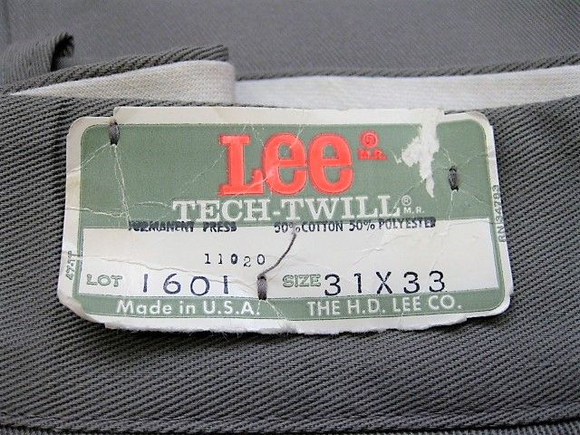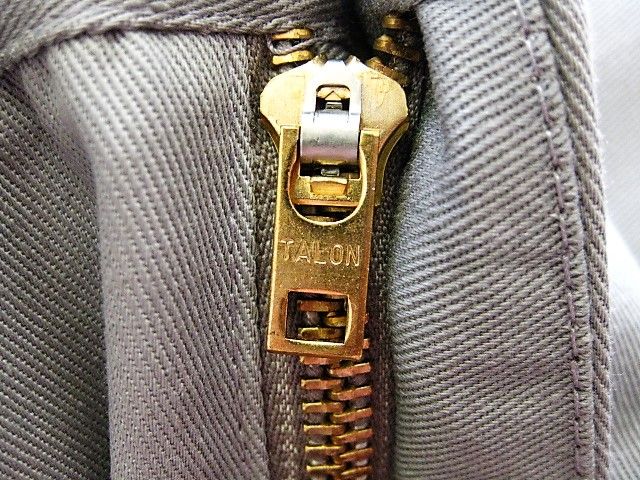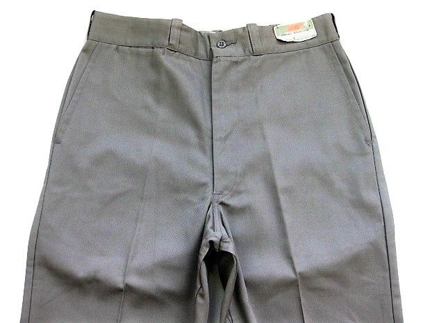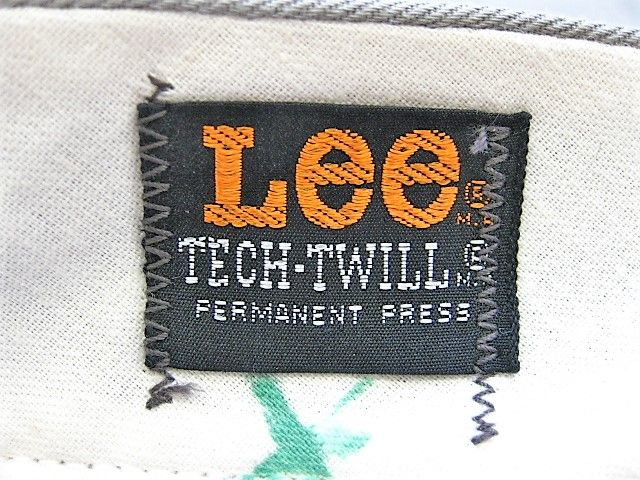 70年代のLee Prest tech twill ワークパンツ デットストックです。サイズ表示はW31L33です。実寸はW78cm L82.5cm ワタリ31cm 裾幅21cm サイド総丈110cmです。ジッパーはTALONのセミオートです。素材はCotton50%/Poly50%のツイル地です。色はグレーです。右のモモ付近に色褪せが少し見られます。生地にダメージはございません。細身で綺麗なシルエットのワークパンツです。未使用のデットストックです。
