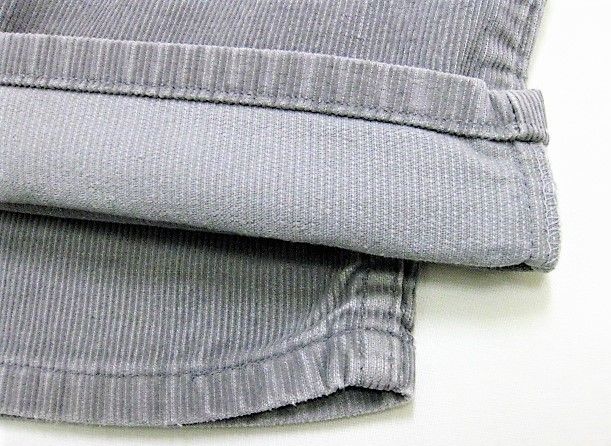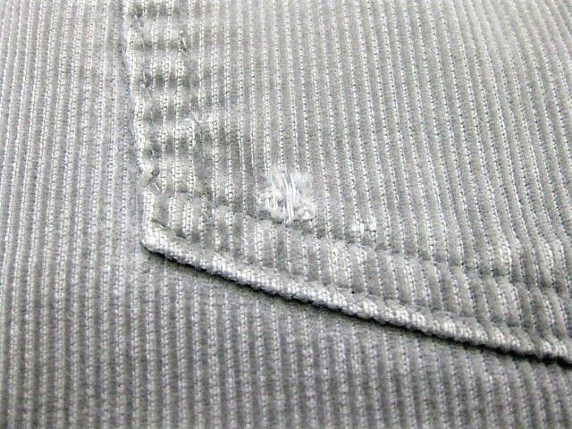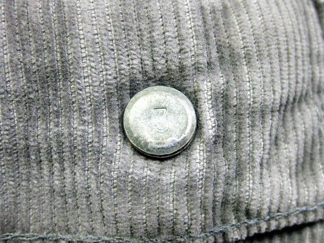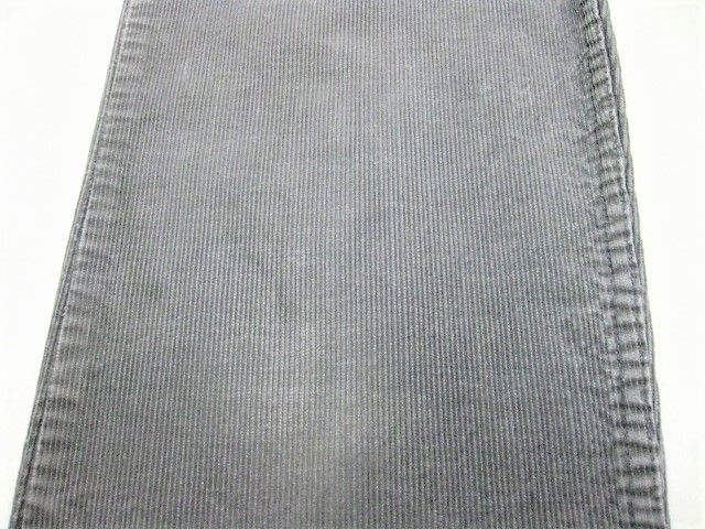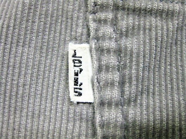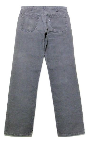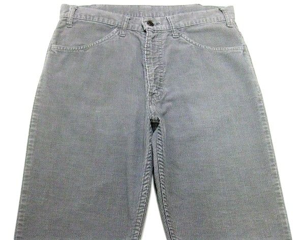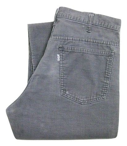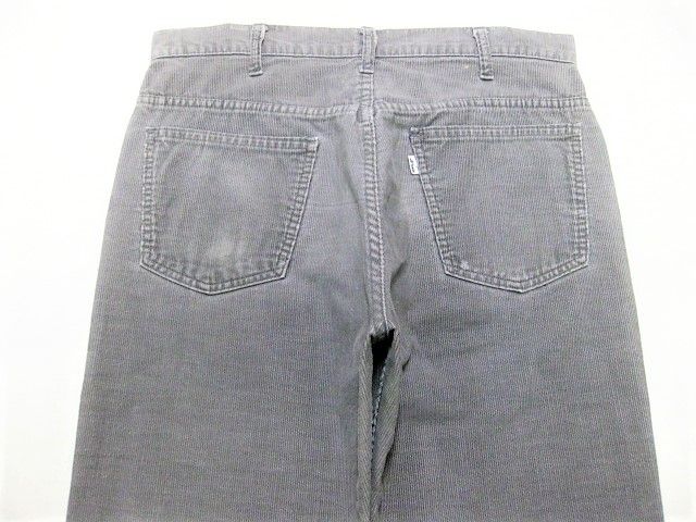 70年代のLevi's 519-1555 コーデュロイパンツです。サイズ表示はW33L32です。実寸はW82cm L78.5cm ワタリ29cm 裾幅19.5cm サイド総丈106cmです。おおよそW32L31位のサイズです。色はグレーです。ジッパーはTALONです。裾はオリジナルと思われるシングルステッチです。全体的に着用感と色褪せが見られます。右膝に薄汚れが見られます。背面の右ポケットに擦れたあとが1か所見られます。生地はしっかりした状態です。