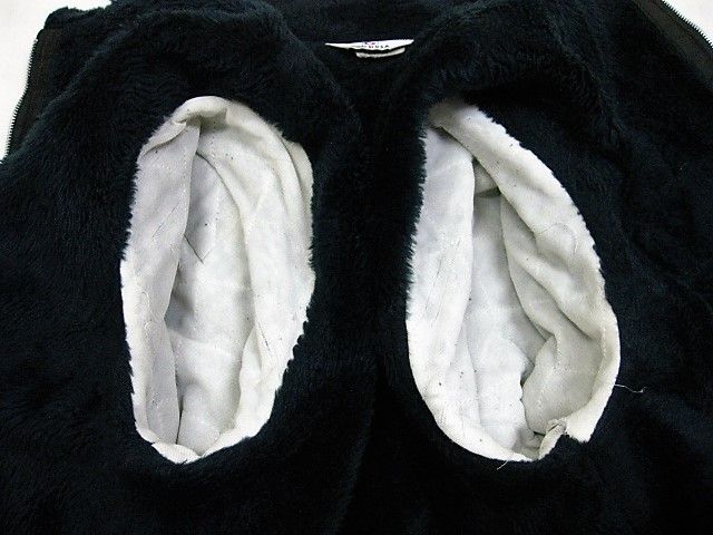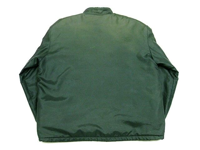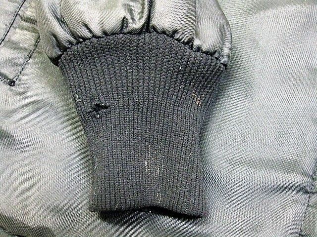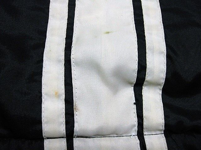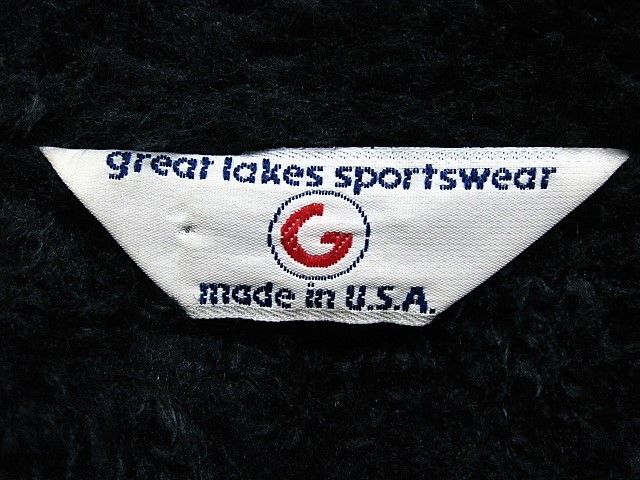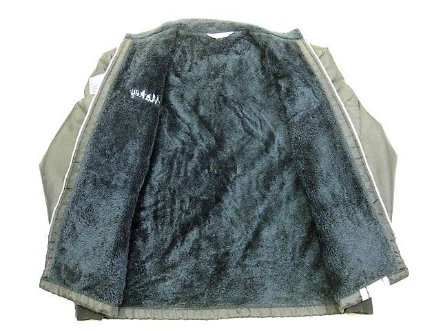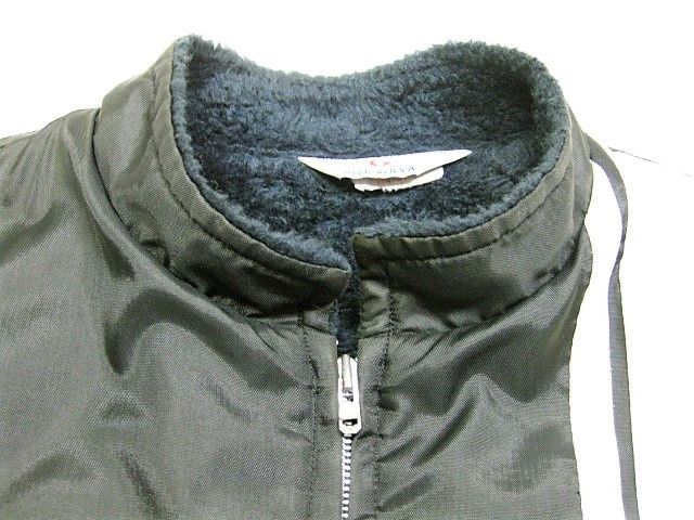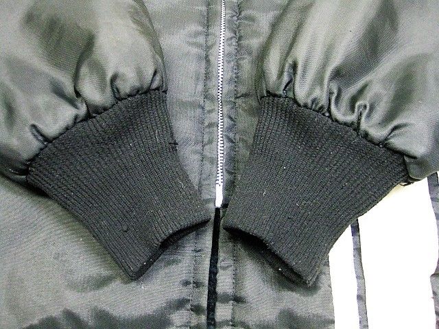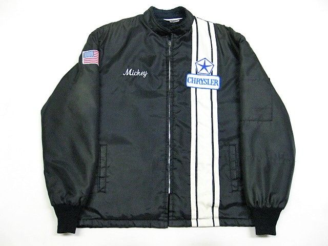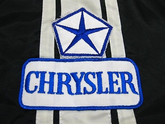 70年代のGreat lakes Sportswear CHRYSLER ナイロン 裏ボア ジャケットです。サイズ表示は見えません。実寸は肩幅58cm 身幅68cm 袖丈67.5cm 着丈72cmです。実寸ではSize-Lのように感じられますが内側にボアが施されているため着用するとSize-M位のように感じられます。表地は黒のナイロン生地、ライナーは黒のナイロンボアが施されております。袖裏はキルティングが施されたナイロン生地です。全体的に着用感と背面の肩付近から袖にかけ色褪せが見られます。右の袖リブにダメージが1か所と汚れが少し見られます。右肘、右胸、背面、フロントの白ライン上に汚れが見られます。左袖に糸抜けが1か所見られます。ジッパーはIDEALです。