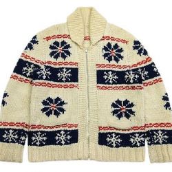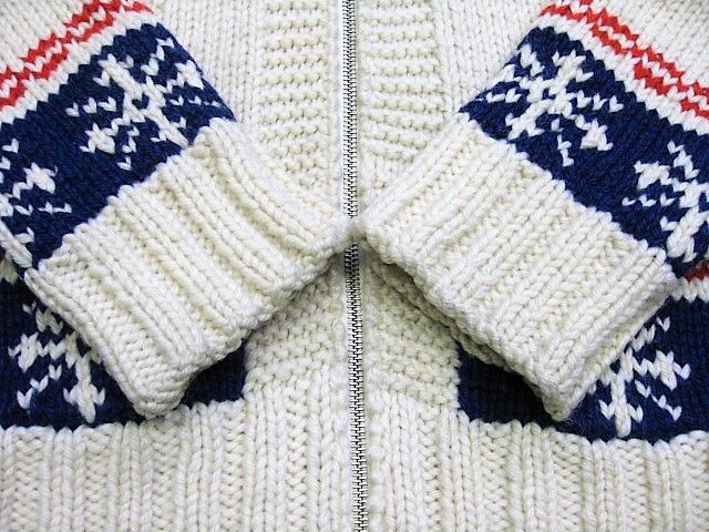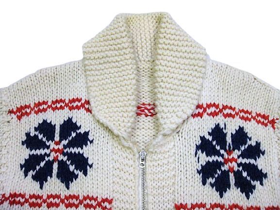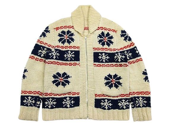 50~60年代の雪柄 カウチンセーターです。実寸は肩幅47cm 身幅56.5cm 袖丈67cm 着丈68cmです。おおよそM位のサイズです。ジッパーはLightningです。色は生成り × 紺色 × 赤です。全体的に着用感が見られます。右胸付近に汚れが1か所見られます。ニットは柔らかくしっかりした状態です。ダメージなどはございません。