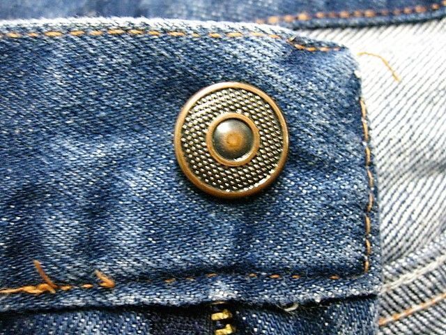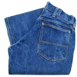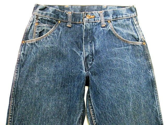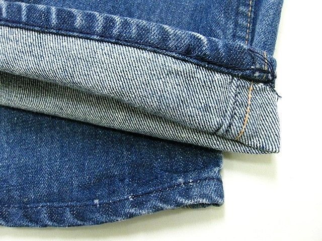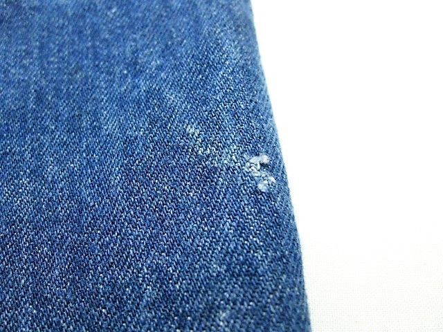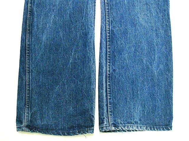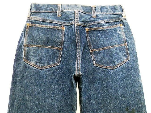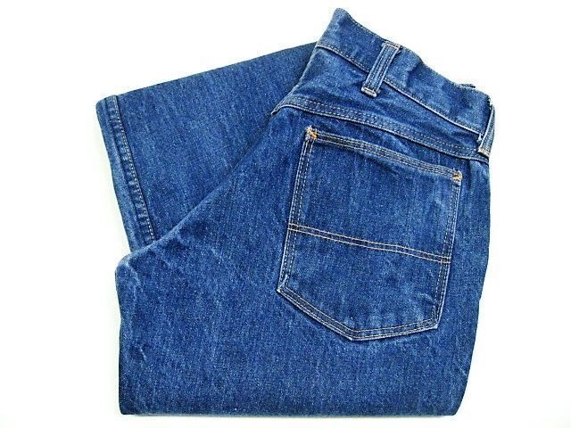 70~80年代のJCPenney Ranchcraft デニムパンツです。サイズ表示はありません。実寸はW74cm L73cm ワタリ29cm 裾幅21cm サイド総丈97cmです。おおよそW29L28.5位のサイズです。全体的に着用感と色褪せ、擦れが見られます。背面の右モモ付近にシミとほつれが見られます。裾はオリジナルと思われるチェーンステッチです。