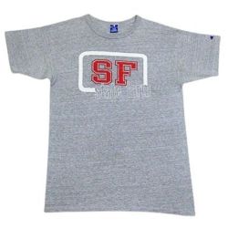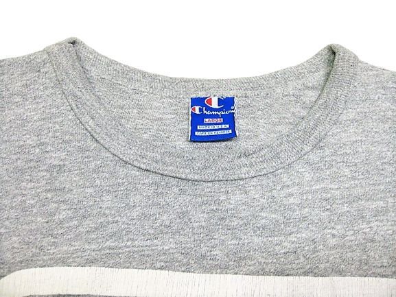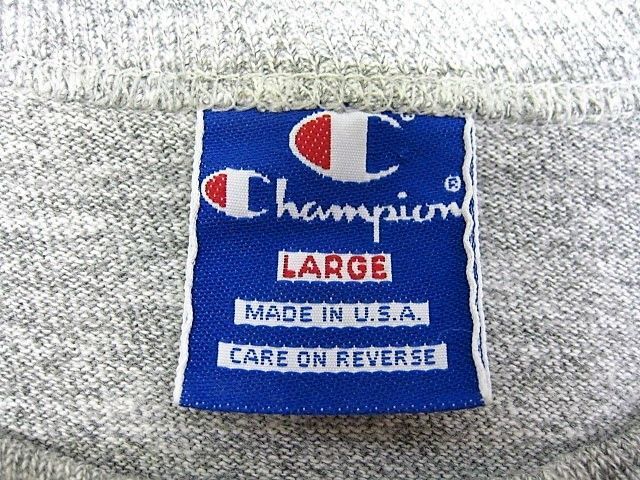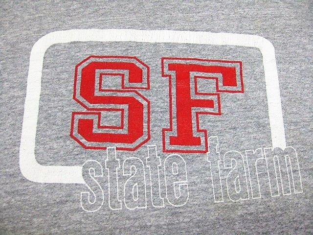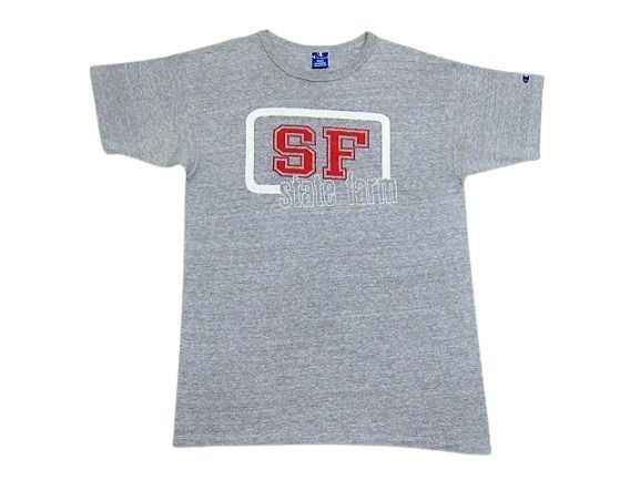 90年代のチャンピオン 青刺繍タグ SF State Farm 霜降りTシャツです。サイズ表示はLです。実寸は肩幅51cm 身幅51cm 袖丈17.5cm 着丈71cmです。全体的に着用感と色褪せが見られます。シミや汚れ、ダメージなどはございません。