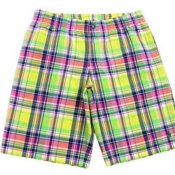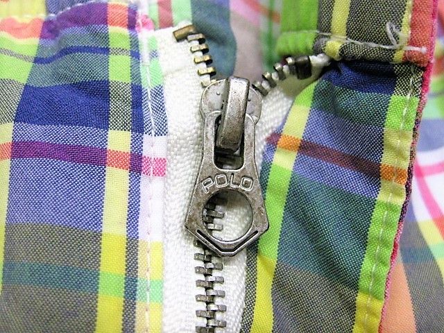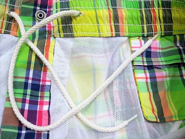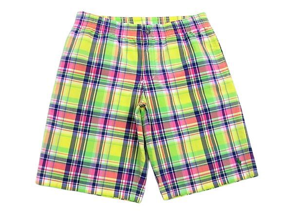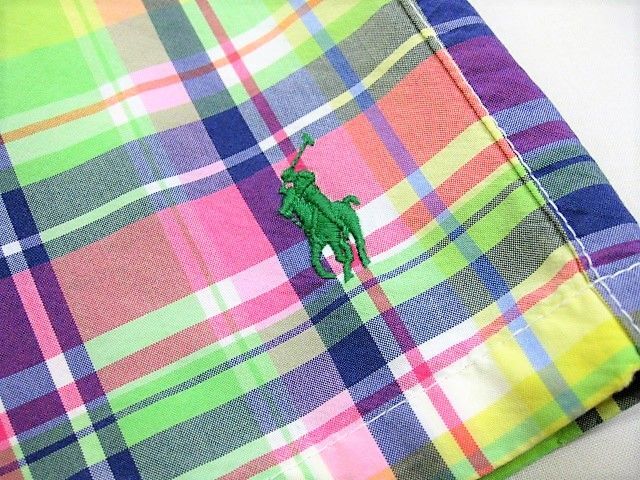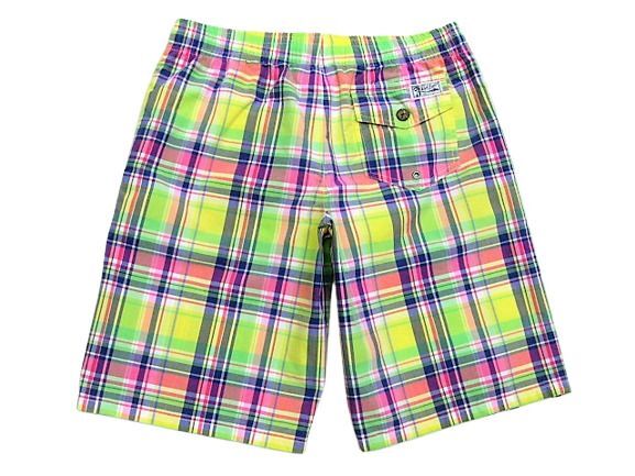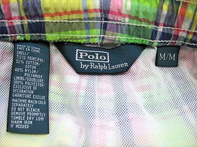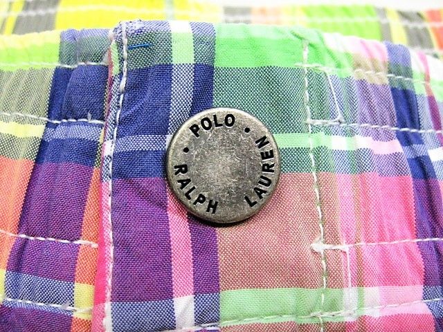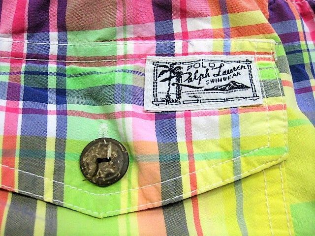 90年代のPolo Ralph Lauren スイムウエア マドラスチェック柄です。サイズ表示はMです。実寸はW79cm~83cm程度 股下26.5cm サイド総丈50cm 裾幅28.5cmです。着用感はさほどございませんが背面に薄汚れが1か所見られます。生地はしっかりした状態です。ダメージはございません。インナーにサポーターが施された海パンですがタウンユースでの使用も可能です。背面にココナッツボタンが付けられたハワイアン仕様 フロントはサイドポケットが施されております。