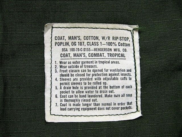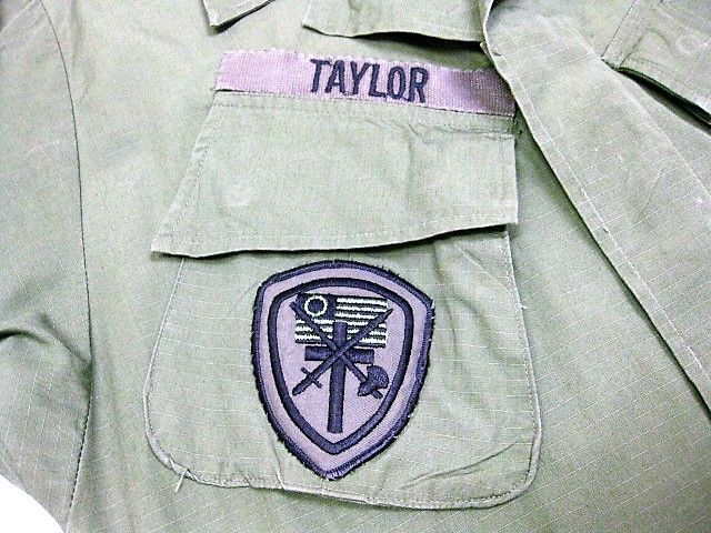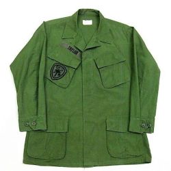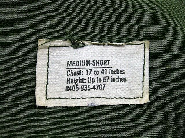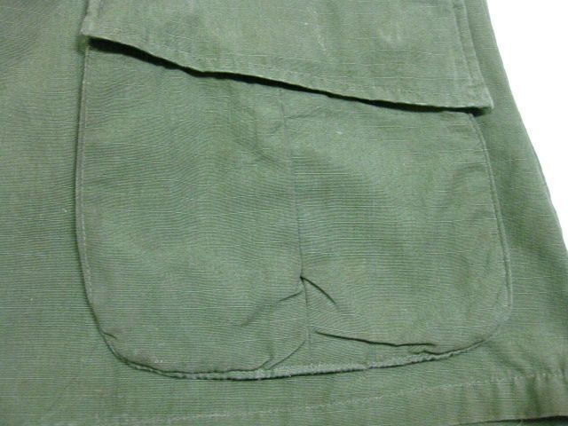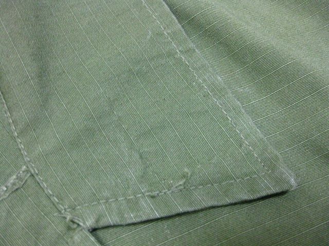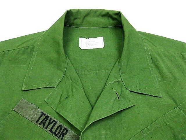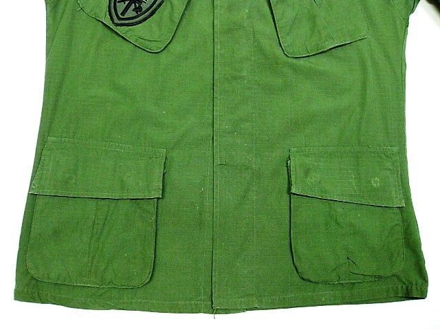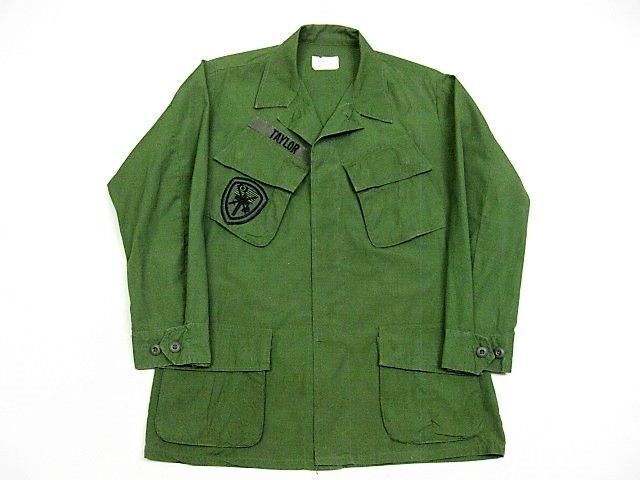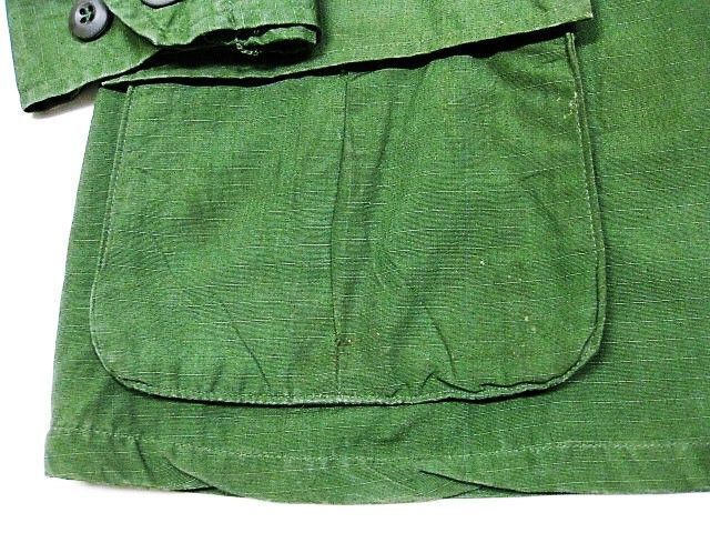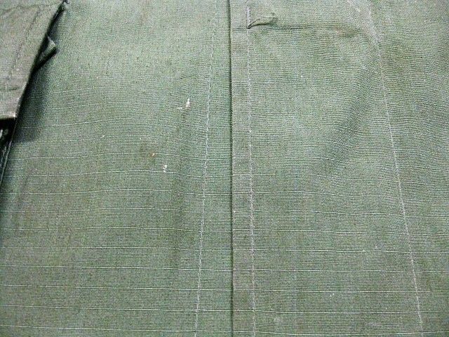 70年のU.S.Army ファティーグジャケット リップストップです。サイズ表示はMediun-Shortです。実寸は肩幅46cm 身幅59cm 袖丈59cm 着丈78.5cmです。素材はPoplin 100%Cottonです。腹部付近と下のポケット付近に薄汚れが見られます。左襟と左胸に付いていたと思われる階級章とパッチが取られた跡が見られます。着用感も少なく感じられ生地の状態の良いファティーグジャケット です。