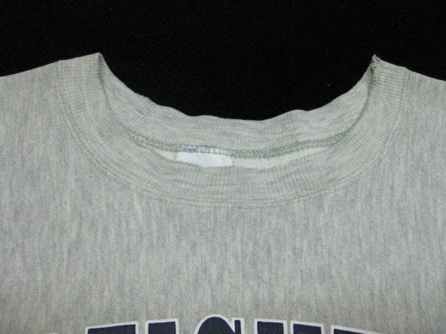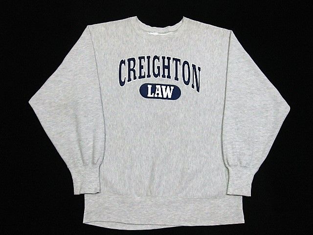90年代のチャンピオン リバースウィーブ 刺繍タグ Creighton Lawです。サイズ表示はXLです。実寸は肩幅52cm 身幅59cm 袖丈66.5cm 着丈73cmです。全体的に着用感と色褪せが見られます。襟のリブと右の袖リブに擦り切れが見られます。キャプセルにLAWの文字 シンプルさがクールな1枚です。