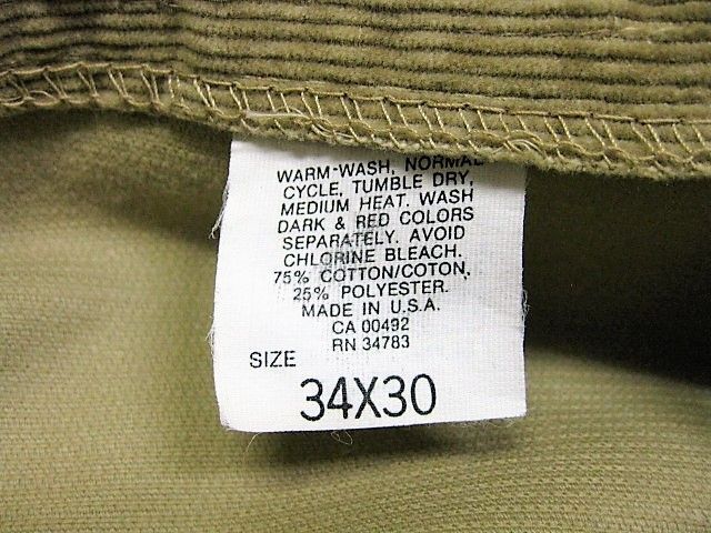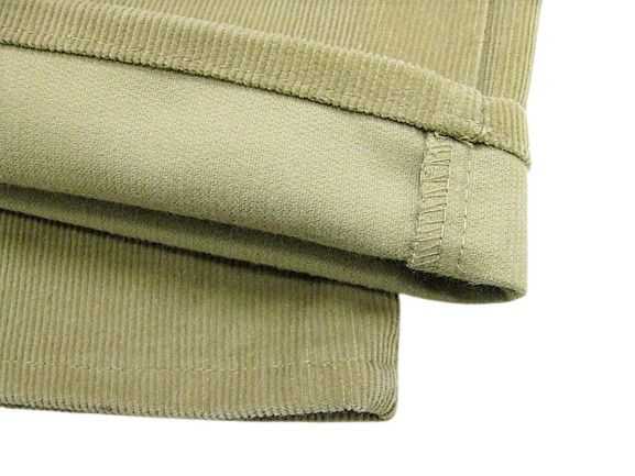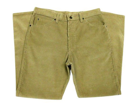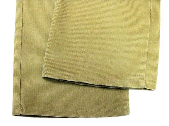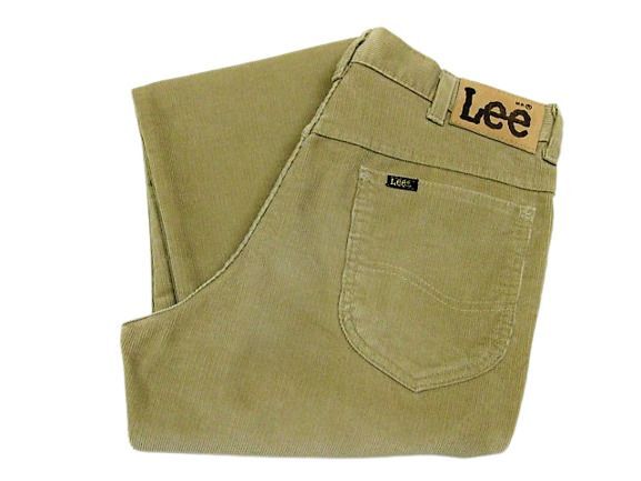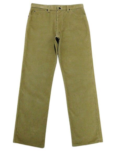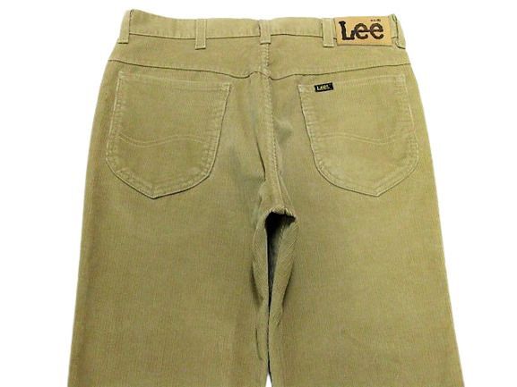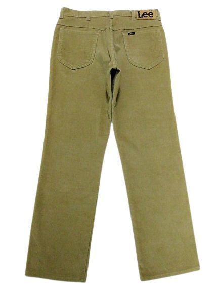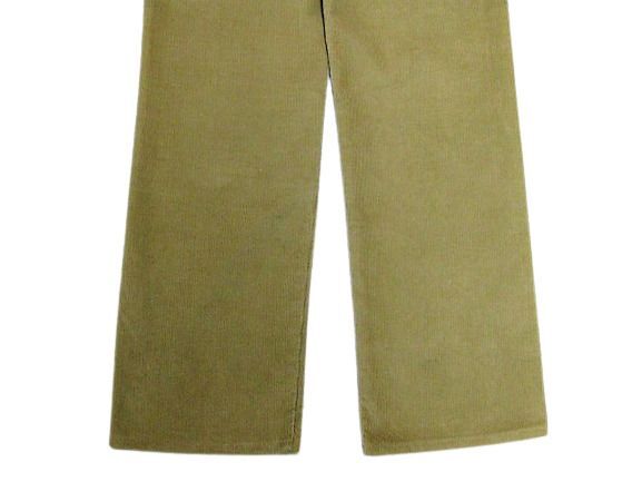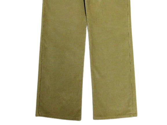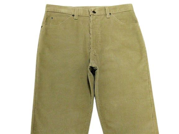 80年代のLee 200番 コーデュロイ パンツ ベージュカラーです。サイズ表示はW34L30です。実寸はW83cm L77cm ワタリ30cm 裾幅20.5cm サイド総丈103.5cmです。おおよそW32.5L30位のサイズです。裾はオリジナルと思われるシングルステッチです。全体的に着用感と色褪せが見られます。フロントの左モモ付近と裾付近にシミと汚れが見られます。生地にダメージはございません。合わせやすいベージュカラーです。