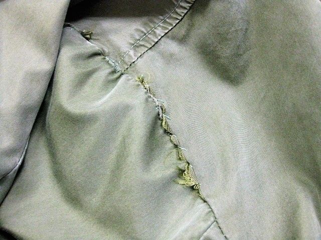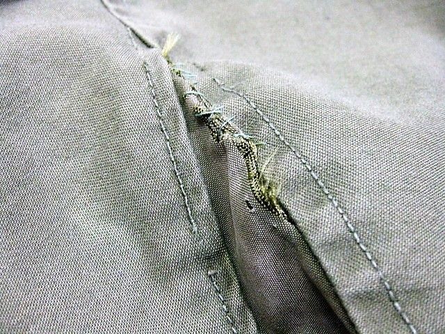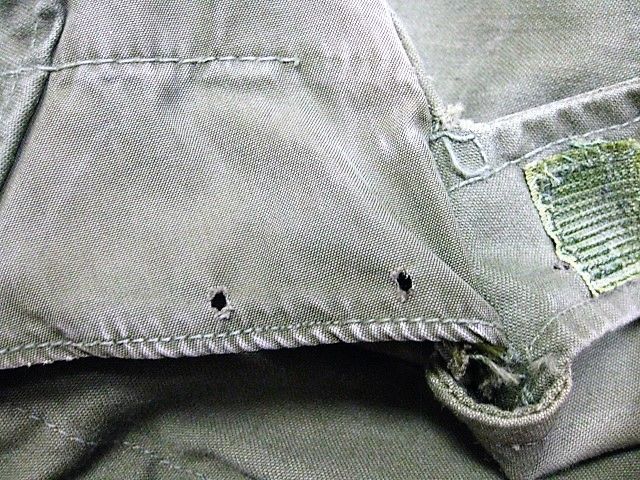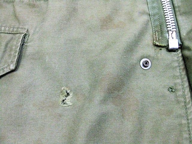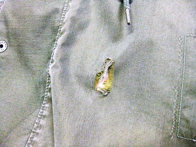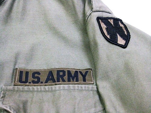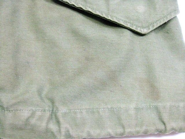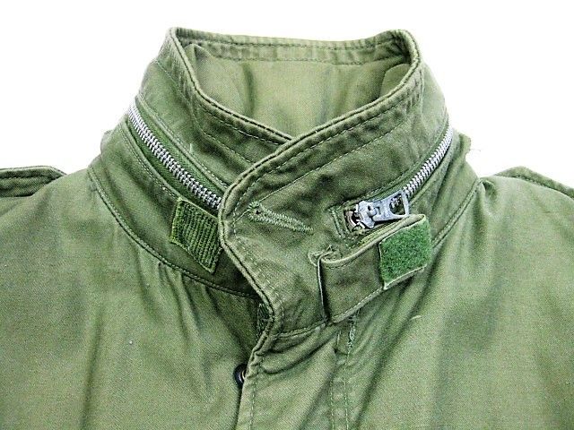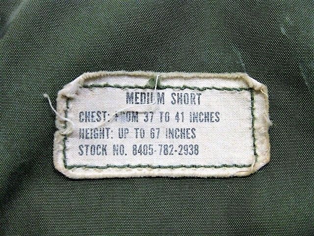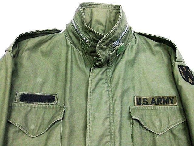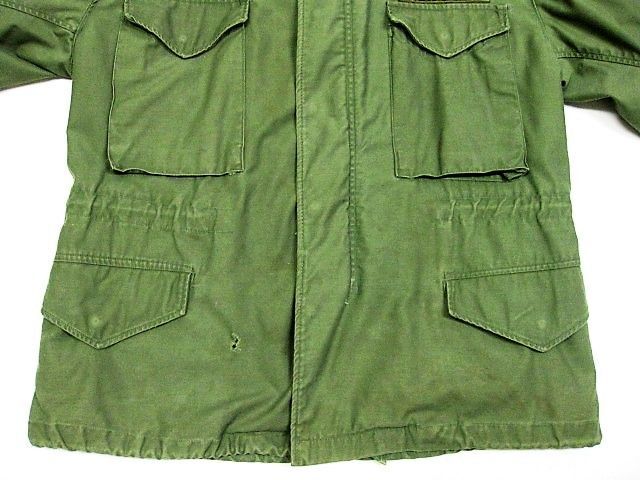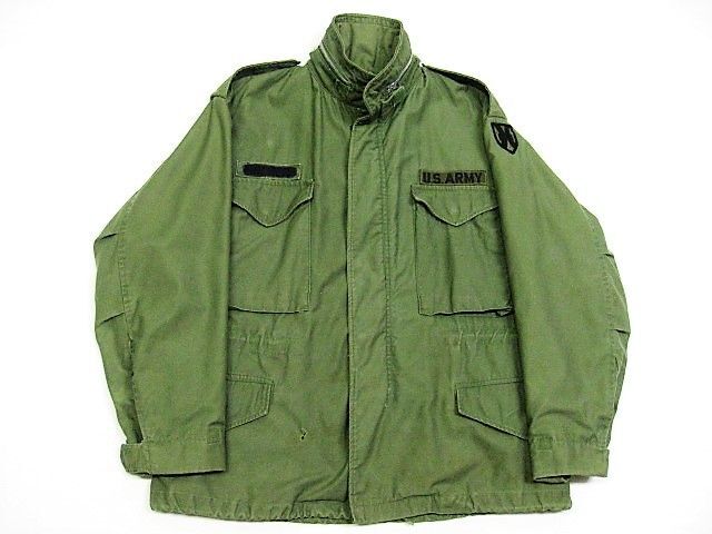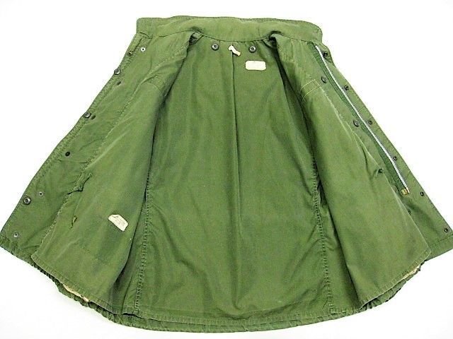 60年代のU.S.Army M-65 フィールドジャケット アルミジッパー 2ndです。サイズ表示はM-Shortです。実寸は肩幅51cm 身幅56cm 袖丈60.5cm 着丈73.5cmです。全体的に着用感と色褪せが見られます。フロントの腹部付近にシミと薄汚れ、ダメージが1か所が見られます。右袖のマチに補修跡とピンホールが2か所見られます。ライナーの右肩付近に補修跡とダメージが1か所見られます。ジッパーは良好です。日本の方の体系に相応しいM-Short丈です。生産期間の短い2ndタイプです。