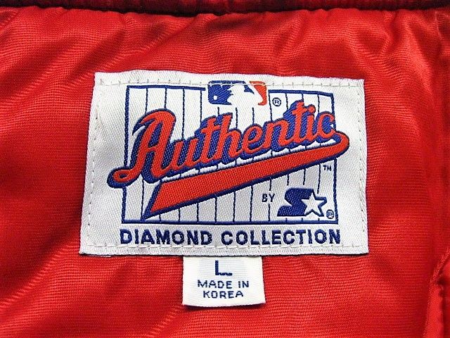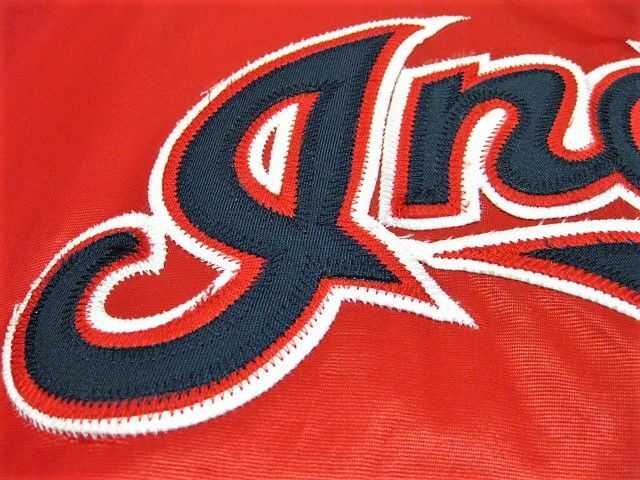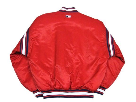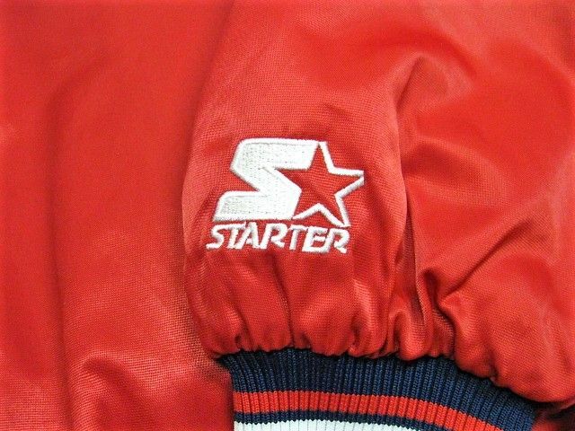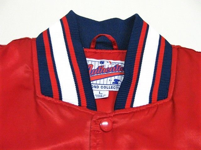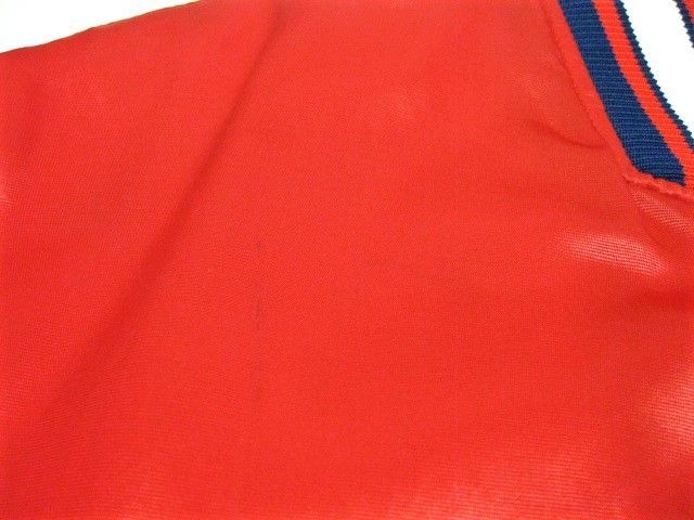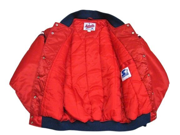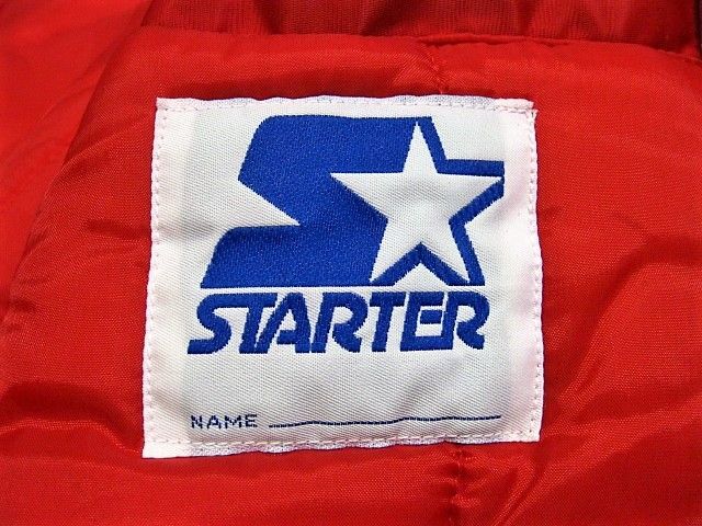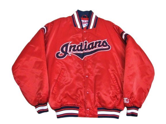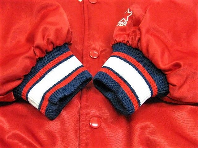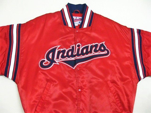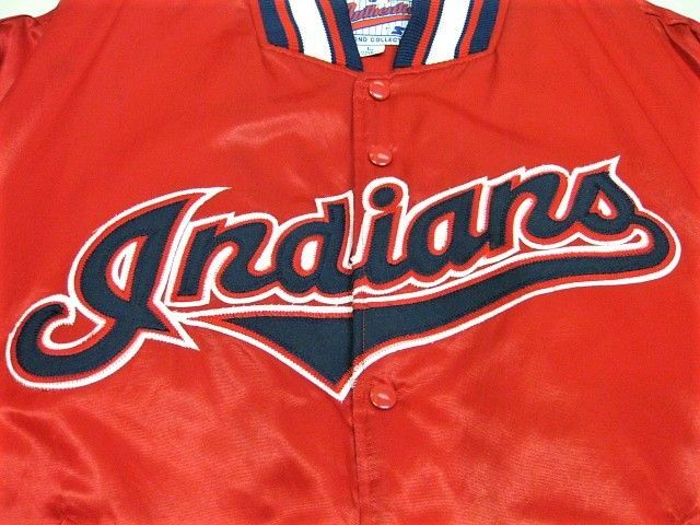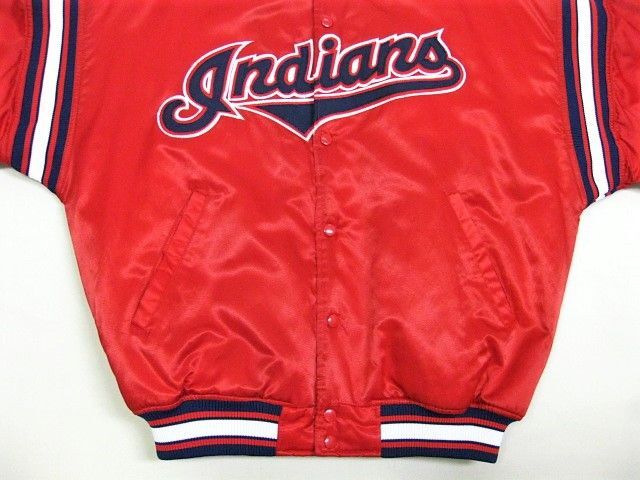 00年代のSTARTER Cleveland Indians サテン スタジャンです。サイズ表示はLです。実寸は肩幅64.5cm 身幅68cm 袖丈59cm 着丈71cmです。全体的に着用感が見られます。右肩付近に薄汚れが1か所見られます。ダメージはございません。表地は厚手のサテン生地、ライナーは中綿が施された厚手のキルティング生地です。サイズ表示はLですが大きめなサイズ感です。今はなきIndiansです。